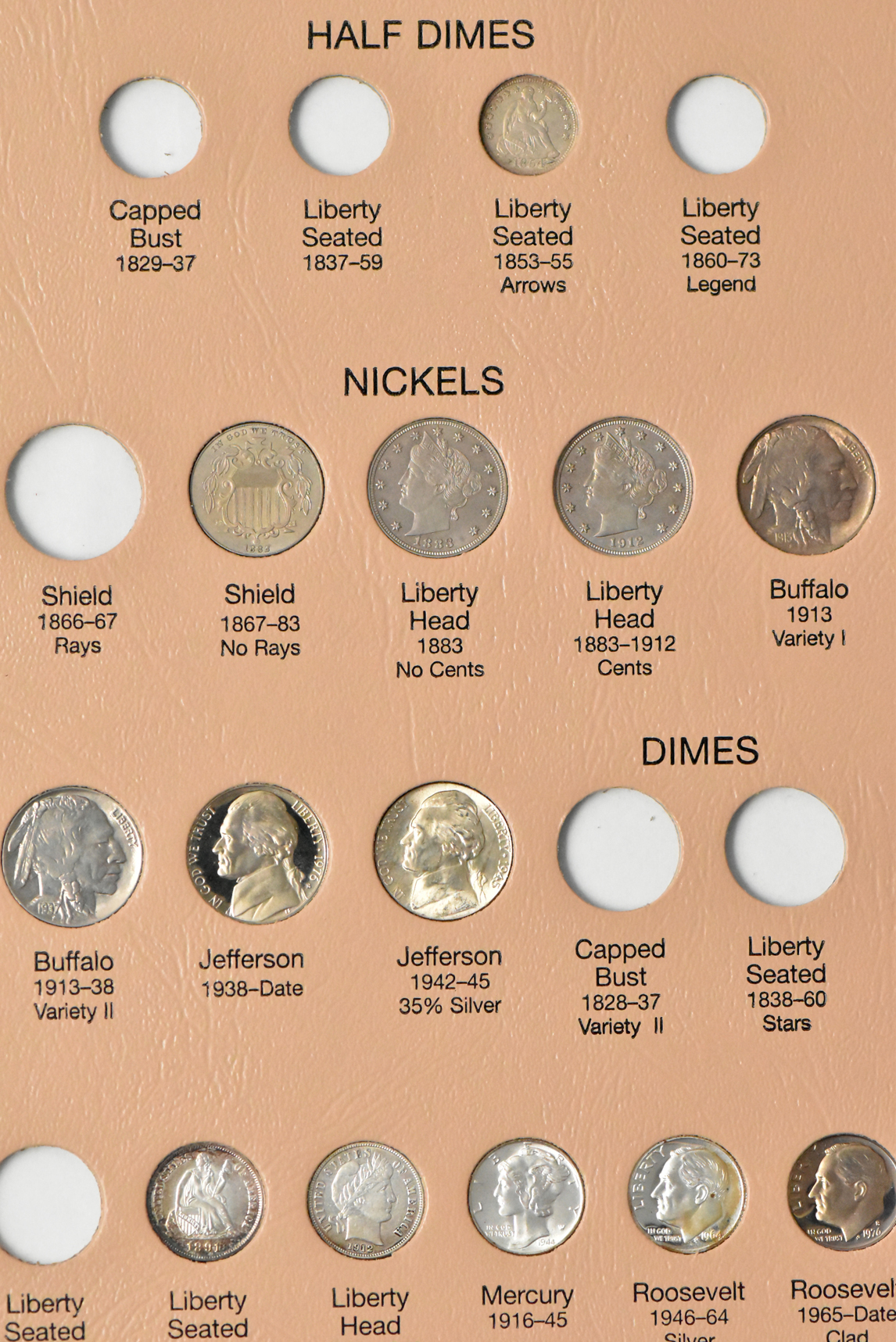 • Putting together a United States Type collection is among the most difficult to accomplish collections in today’s marketplace. There are fifty-seven pieces of the puzzle inside of a partially finished Dansco album that includes the following notable issues: an 1833 Classic Head half-cent (XF), an 1853 Coronet large cent (XF), an 1857 Flying Eagle cent (BU), an 1859 Indian cent (XF), an 1863 CN Indian cent (AU), a 1901 Indian cent (CHBU), an 1869 Two cent piece (AU, cleaned), an 1853 Three Cent silver (AU+, cleaned), an 1866 Three Cent Nickel (CHBU), an 1854 arrows Seated Liberty half-dime (AU), an 1882 Shield nickel (AU+), an 1883 No Cents Liberty nickel (BU), a 1912 Liberty nickel (AU++), a 1913 Type 1 Buffalo nickel (CHBU), an 1891 Seated Liberty dime (AU++), a 1902-S Barber dime (AU), an 1875-S Twenty Cent piece (AU, cleaned), a 1916-D Barber quarter (AU, cleaned), a 1917 Type 1 Standing Liberty quarter (AU), an 1821 Capped Bust half-dollar (XF), an 1857 Seated liberty half-dollar (AU, cleaned), a 1907-D Barber half-dollar (AU, polished), a 1942 Walking Liberty half-dollar (BU), an 1877-S Trade dollar (AU, cleaned), and an 1896 Morgan dollar (BU) (ck).