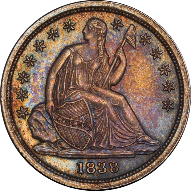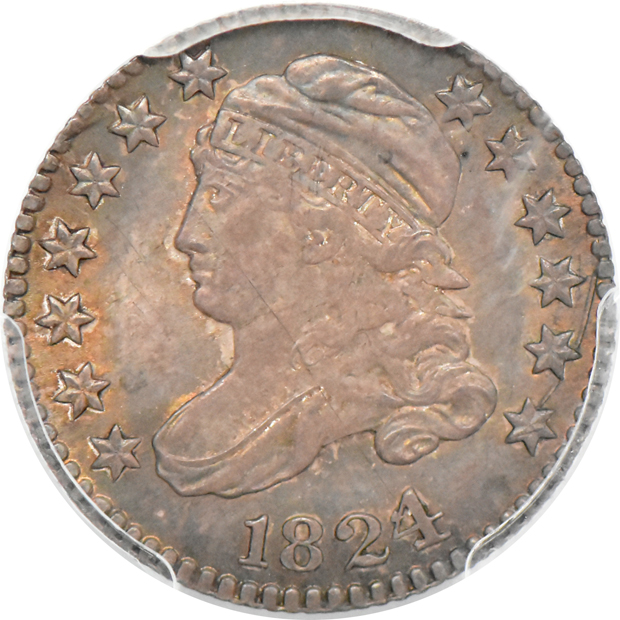 • KM#104.1, Mexico City mint. A tremendous example, deeply original ebony-grey patina overall gives way to noticeable album toning on the obverse, joined by glowing, peripheral chartreuse coloration on the reverse. What appears to be a scratch or adjustment mark at first glance seems likely to be a struck-through wire up on closer examination.