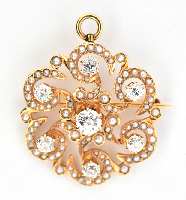 • A striking sunburst style pin/pendant combo with seven old European cut diamonds weighing an estimated 1.00 cttw, SI clarity, I-J color with small seed pearl accents swirled around the diamonds. Dimensions 1” x 1”, 3.7 dwt.
