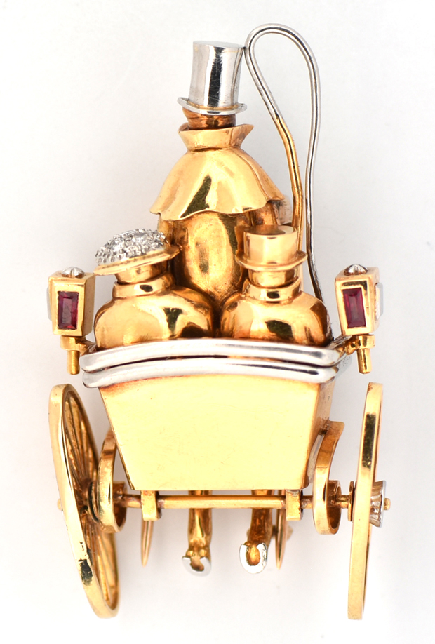 • A retro-modern 18K gold and platinum (tested) dress clip – fur clip embellished with diamonds and rubies. Crafted in Austria, the pin depicts a couple riding in a horse drawn carriage. The hat of the lady is studded with five round brilliant diamond accents while the lantern lights are made of synthetic faceted rubies. An estate piece, the pin will include a copy of a letter that was found with one of our prior offerings from the estate of August A. Busch, Jr (1899-1989). Dimensions: 2” x 1.2”, 13.4 dwt.