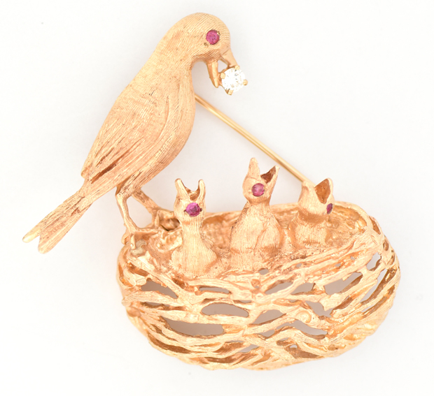 • A vintage mid-century 14K yellow gold pin depicting a mother bird feeding her babies. Retailed exclusively by USA goldsmith Frank J Golden to the American market, the detail to the pin is amazing. Mama bird holds a diamond in her beak that measures approximately .05 ct., SI clarity, G color. The baby bird eyes are faceted round rubies that measure 2mm each. Dimensions: 1.75" x 1.75”, 11 dwt.