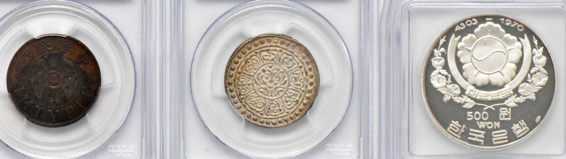 • Four different countries from the continent of Asia are represented within this massive eleven-coin group lot of NGC and PCGS certified examples. There are five NGC certified issues that includes an (1890-1908) China 20C Kwantung MS-62, a (1903) Japan 50S MS-63, a 1905 Korea 1/2W AU-55, a 1905 Vietnam 1/600P Tonkin MS-61, and a 1906 China 10C Hunan XF-45BN. The remaining six pieces are PCGS certified and includes an (1868-69) Japan Shu AU-58, an (1868-69) 2 Bu Japan AU-50, a 1909 10C Kiau Chau AU-58, a (1912-1918) Tangka Tibet AU-53, a (1928) 1C China-Shensi Genuine, and a 1970 Korea 500 Won PR-64 DCAM (ck).