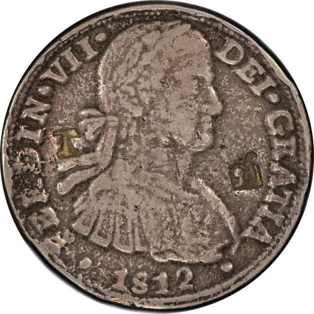 • M#123, Chihuahua mint. How PCGS is able to come up with such an exacting grade for a crudely cast 8-reales is difficult to ascertain, but suffice it to say the surface shows evidence of a fair amount of circulation. Dies were not available in Chihuahua circa 1810-1813 during the Mexican War of Independence, forcing the mint to resort to casting 8-reales from molds which were themselves produced from struck coins. Because of their similarity to cast counterfeits, each had to be officially counterstamped to ensure acceptance in commerce.