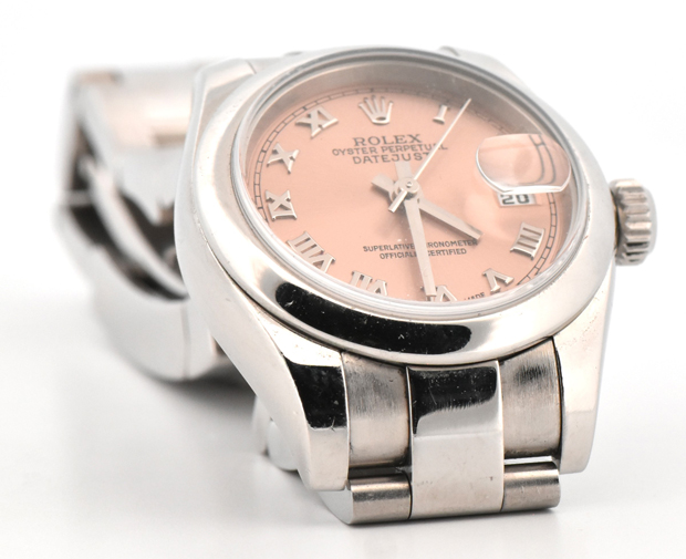 • Here is a 2006 stainless steel ladies Rolex with a pink Roman numeral dial and automatic movement. It is an elegant and classic design with five removable links (no extra links). Includes box and papers. Winds, sets, and runs.