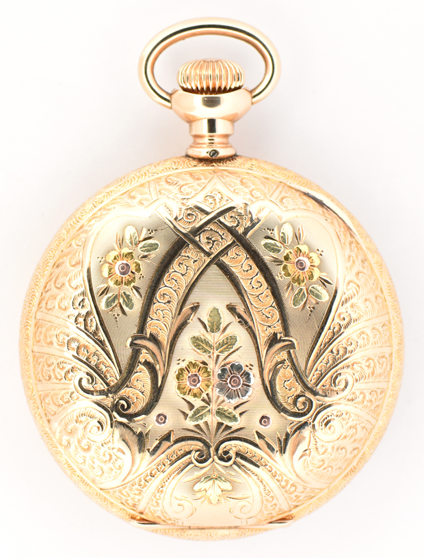 • Here’s a 14K yellow gold pocket watch with accents of rose and light green gold in a floral, shield, and leaf design. Winds, sets and runs. 98.1 dwt.