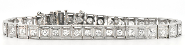 • Here we have a gorgeous vintage diamond line bracelet with square links that each have milgrain around a European cut round diamond and a beautifully cut edging that adds to the glamour! The diamonds weigh an estimated 3.50 cttw, SI clarity, I-J color. There is a safety chain attached. Length 7.5”, 11.9 dwt.