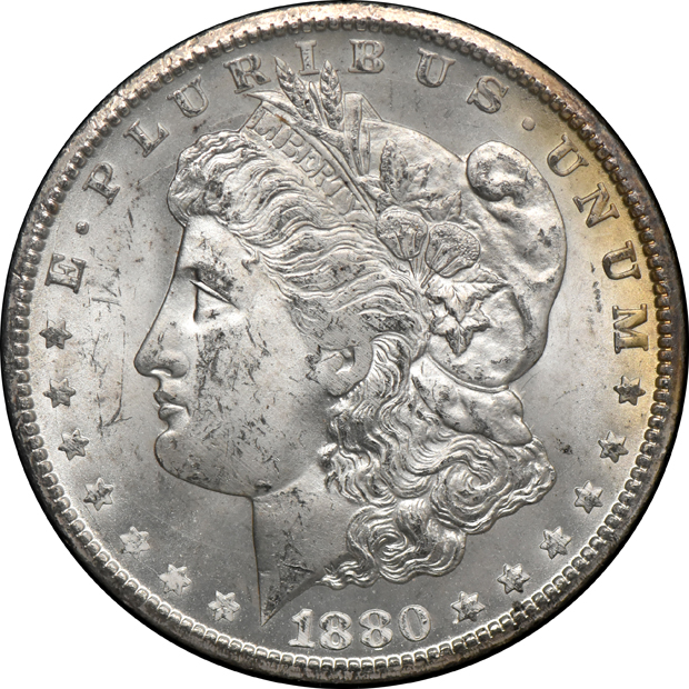 • Cataloger's grade: [MS-62] with the usual caveat being that the second opinion is "through the plastic". But even careful examination finds no evidence of cleaning, a few wispy hairlines on the cheek and being of trivial note. The reverse shows certainly more vibrancy than average for 1896-O while the obverse appears noticeably more subdued and also features bag abrasions on the lower cheek and left field.
