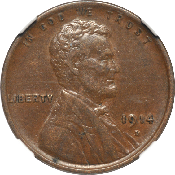 Description: Absolutely fantastic surface texture and color, and glossy texture immediately mark this as a terrific representative of the second key to the Lincoln cent series. The XF grade for 1914-D represents that magic point at which the value about doubles that of the lower grade, yet is only half that of the next higher grade, and this is a "sweet spot" for many astute collectors. Only a few very tiny contact ticks attest to modest circulation, yet for sure, this is a superb quality example for XF-40.
