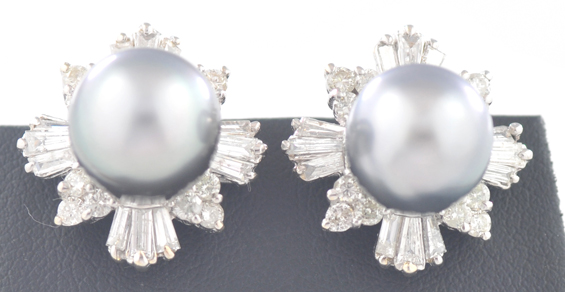 Description: These striking 10.5mm Tahitian pearl earrings have approximately 1.75 cttw in tapered baguettes and brilliant cut round diamonds, SI2-I1 quality, I-J color. These earrings have omega backs and are really quite elegant. 7.5 dwt.