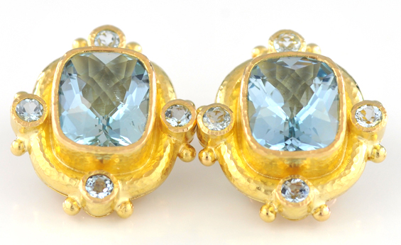 Description: These bold 18K yellow gold designer earrings each have a 12x10mm cushion cut blue topaz set in the center and a 3mm round blue topaz at the North, East, South and West. These earrings also have an omega back with a collapsible post for non-pierced ears. 11.8 dwt.