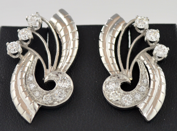 Description: These retro earrings are just fabulous! There is an estimated .80 cttw in old cut round diamonds, VS2 quality, I color. They measure an inch long and have a textured gold design. 2.4 dwt.