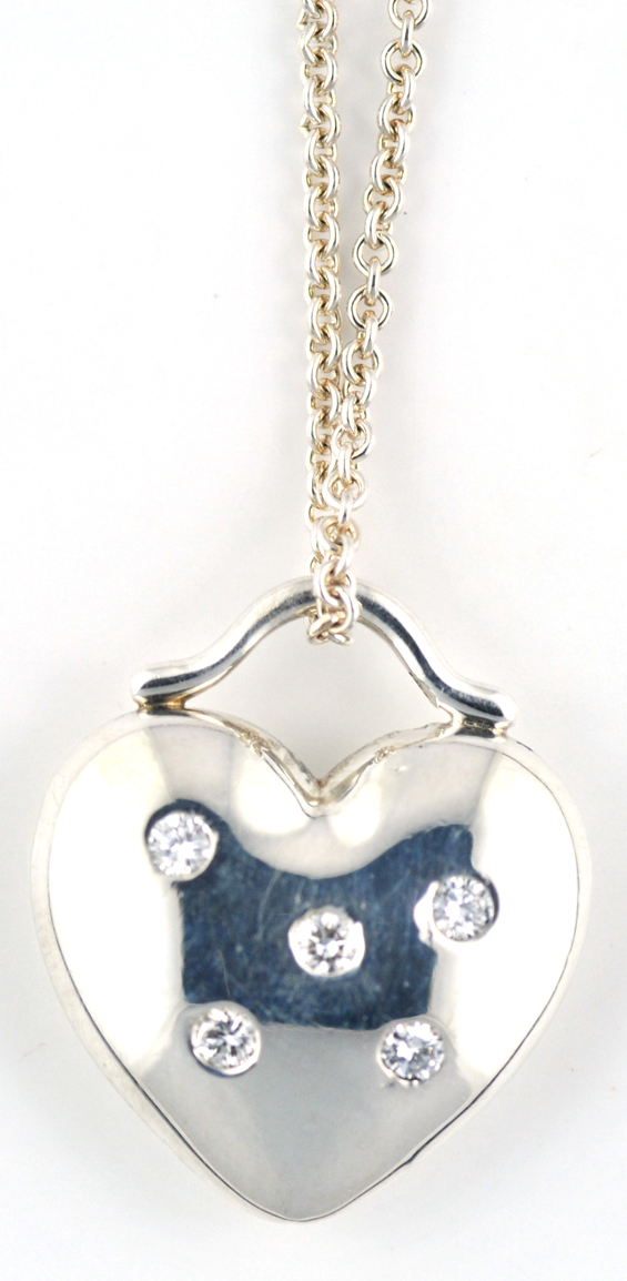 Description: This lot contains five Tiffany and Co. necklaces. The first necklace is a Tiffany and Co. 16” sterling silver puffed heart diamond necklace with .26 cttw in brilliant cut round diamonds. The second is a Tiffany and Co. 16” sterling silver heart in heart necklace. The third is a Tiffany and Co. 16” sterling silver return to Tiffany heart necklace. The fourth is a Tiffany and Co. 18” sterling silver large notes New York round circle necklace. The fifth is a Tiffany and Co. 16” sterling silver Peretti diamond necklace with a .03 ct. brilliant cut round. All five necklaces come with either a Tiffany and Co. pouch and box or a dust bag.