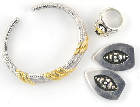 Description: This box is filled with miscellaneous sterling silver designer items. There is a Judith Ripka necklace and a matching cuff and ring, a pair of John Hardy earrings and two rings and a pair of Georg Jensen earrings. This lot also comes with a pair of 14K and sterling silver signed earrings and two rings that are presumed to be designer, but are not marked. One is an 18K and sterling silver amethyst frog ring and the other is a sterling silver red stone ring with an insect cut-out and diamonds. The total weight is 5.36 troy ounces.