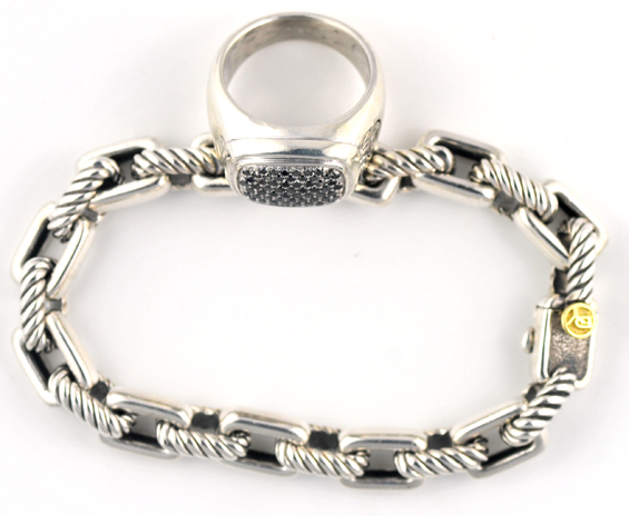 Description: Here we have an 18K and sterling silver man’s David Yurman 9mm Empire link 8.5” bracelet and a sterling silver man’s black diamond signet ring. Ring size 10.