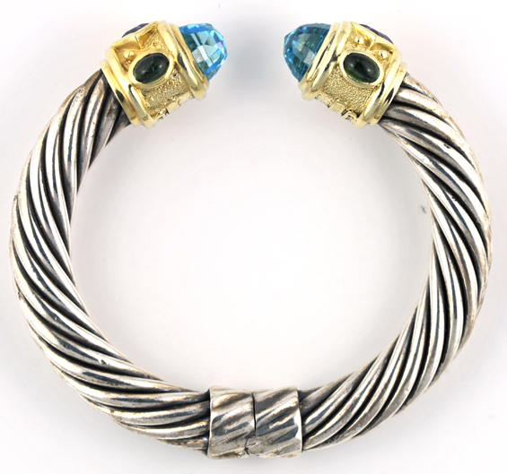 Description: Here we have a 14K and sterling silver David Yurman Renaissance bracelet with blue topaz, amethyst and peridot. Unfortunately, one of the amethyst is chipped. We also have a 14K and sterling silver David Yurman blue topaz Noblesse ring. Unfortunately, the blue topaz is chipped and scratched. Ring size 5.75. The total weight is 1.98 troy ounces.
