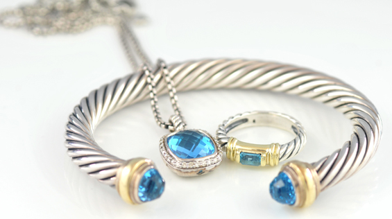 Description: This lot includes a 7mm cable bracelet with blue topaz stones on the ends and 14K yellow accents. To go along with it is a 4mm cable ring with an emerald cut blue topaz and 14K yellow gold. Completing the set is a blue topaz and diamond pendant on a classy David Yurman chain. Length 17”, Ring size 6, 1.90 troy ounces.