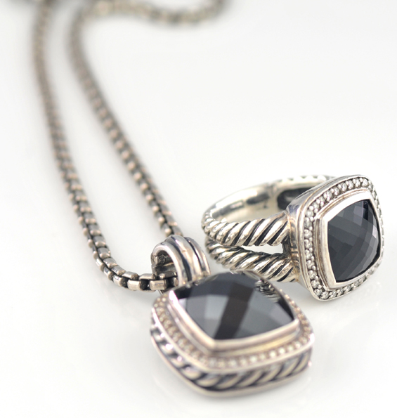 Description: Both from the Albion Collection, this matching pair is perfect for those that love the classic David Yurman fashions. They both contain a checkerboard black onyx stone and a surrounding diamond halo, and together have roughly .50 cttw in diamonds with SI quality, G-H color. The David Yurman chain measures 18” long and completes the necklace nicely. 1.13 troy ounces.