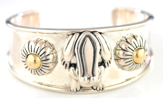 Description: This sterling silver cuff bracelet has a frog sitting on top, a classic theme for Kieselstein Cord, and flower decals on either side with 14K yellow gold accents. This will fit an average sized wrist, 2.32 troy ounces.
