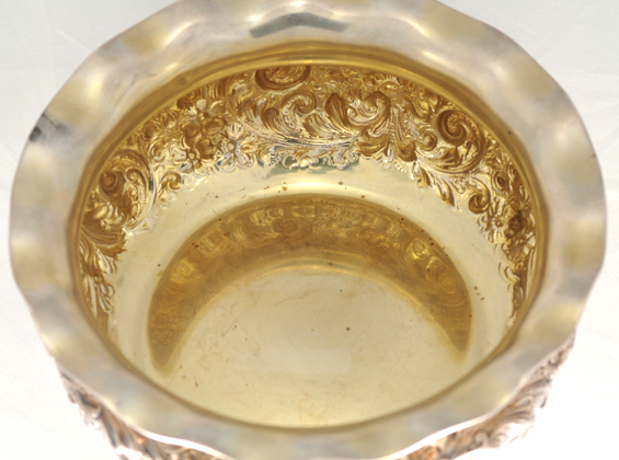 Description: Made by J. E. Caldwell, this repoussé bowl is just gorgeous! There is a monogram engraved but it is on the bottom of the bowl. The inside has a gold tone and the piece is in great condition. It measures 8” across and sits almost 4” tall. 14.5 troy ounces.