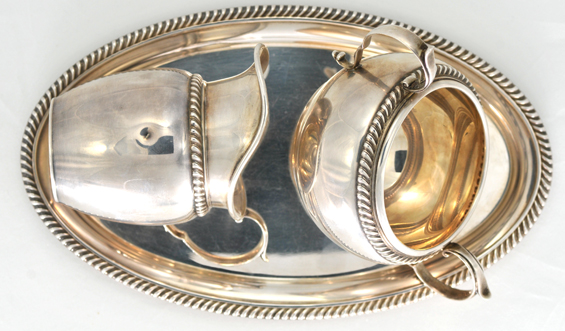 Description: This set is made by Gorham and is in great condition with the exception of one dent in the creamer. There is no monogram and the tray measures 9” long by 5.25” wide. 12.55 troy ounces total.