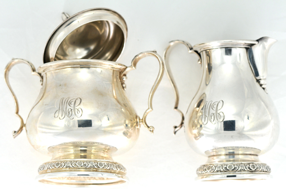 Description: Crafted in the Prelude pattern, this tea service is in great condition. The coffee pot weighs 27.1 tr. ozs, the tea pot weighs 25.9 tr. ozs, the sugar and creamer weigh 20.8 tr. ozs together and the hefty tray that it all sits upon weighs 73 tr. ozs. All of the pieces have the “McC” initial engraved on it. You will be serving tea in the most stylish way possible!