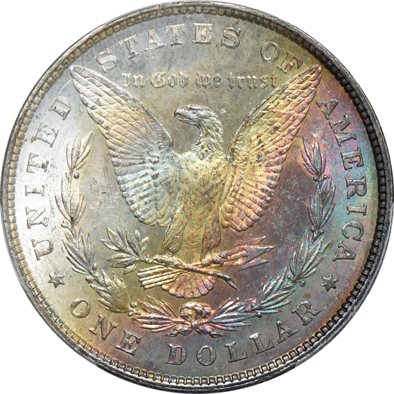Description: Marvelous eye-appeal derives from the presence on the reverse (mounted up in the PCGS slab) of a wide swath of vivid rainbow toning. Bands of chartreuse-grey, sea foam-green, dandelion, magenta-blue and midnight cobalt descend down this side, complemented on the reverse with a pretty, colorful arc over the portrait.