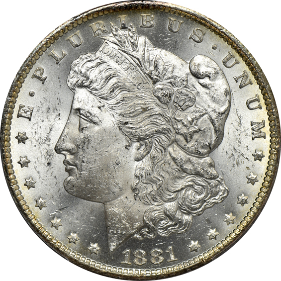 Description: Christopher Leilani Consignment. VAM-3 can most readily be identified by the lengthy, interrupted horizontal die gouge that is most visible just above the leftmost berry pair. Slightly flashy, this example exhibits energetic plate-like luster and gets embraced by an attractive golden ring around the rims. Solidly struck, but each side displays the moderate abrading associated often seen for the date.
