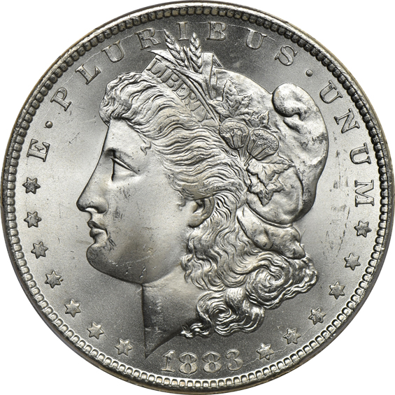Description: VAM-7 in nearly any die state can be reliably attributed by the shape of the die cracks through the date that almost appear to derive from the doubling of the serif in the "1". Solid definition misses absolute precision only over the ear, where a series of very fine die striations remain. Astounding, huge, swooping flower petal luster dominates the blistering white eye-appeal.