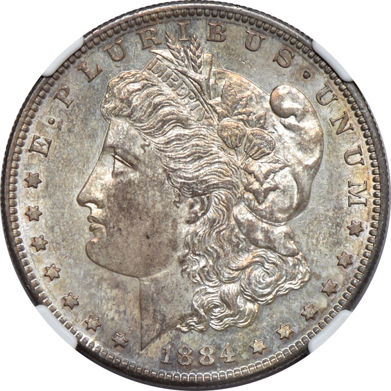 Description: 64 graded MS-60, 360 higher at NGC (certainly inflated by resubmissions). Price guides frankly exaggerate the value of the 1884-S in AU grades, but at any worthy mint-state level, the date becomes the very definition of 'grade rarity'. Unc examples are terribly elusive, and even the basal MS-60 grade will command respect in an auction setting. Ample luster revolves within the fields beneath a blanket of butterscotch toning, while central areas of the obverse must be interpreted beneath a slightly denser layer of greyish patina. This disguises the presence of a few brief hairlines on the cheek.