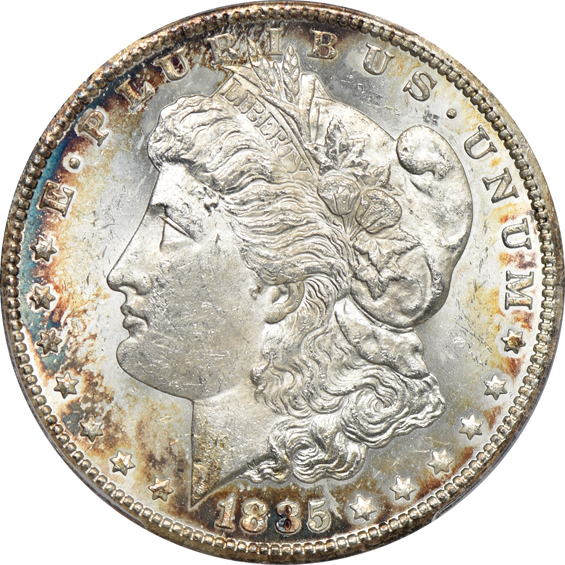Description: VAM-2 has a light dash beneath the second "8". Seemingly undergraded at first glance, the flashy luster and attractive rim color suggests at least choice consideration. A closer look discovers a scrape at the top of Liberty's brow, affirming the grade.,