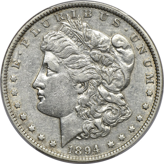 Description: Riser Handle Collection. Universally regarded as a top key to the series, the 1894 dollar is sort of the opposite of a "conditional rarity", as it commands a chunky price in every grade, from Fair through the present XF-45. As a minimally marked, thinly toned (if toned at all) example, the clean, beige-grey surface and convincingly bold detail will easily entice strong bids. Fragile luster remains preserved within protected areas.
