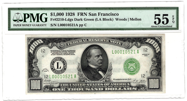 Lot Title: 1928 $1,000 San Francisco Fr# 2210-Ldgs - PMG AU-55 EPQ