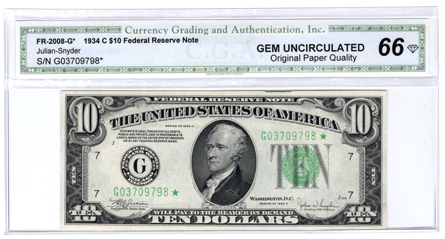 Description: Rich Furs Consignment. Hard to find CGA 66 1934-C Federal Reserve Note star from Chicago district (Scotia described).
