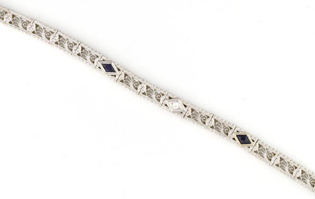 Description: This sweet straight-line bracelet has filigree openwork and a small diamond accent in the center with a blue stone on each side. Length 7”, 6.4 dwt.