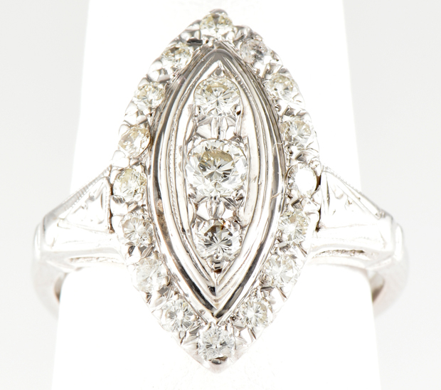 Description: With over .50 cttw in brilliant cut round diamonds, this diamond ring is fashioned in the shape of a marquise. The diamonds are SI1-I1 clarity, I color. Ring size 6, 3.7 dwt.