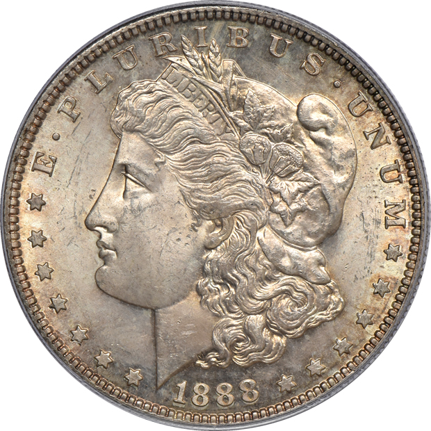 Description: 384 in MS-65 and 63 higher at PCGS. The 1888-S is an always sought after semi-key date in the Morgan dollar series but rarely do they become available in MS-65 condition. The current example has strong cartwheeling luster on both sides with an absolutely wonderful strike that gives depth to Lady Liberty's portrait. The obverse and reverse both have light golden toning covering the surfaces and only a small scuff mark on Liberty's cheek holds this better date back from higher grades. This coin is destine for a registry quality Morgan dollar set. Good luck bidding (ls)!