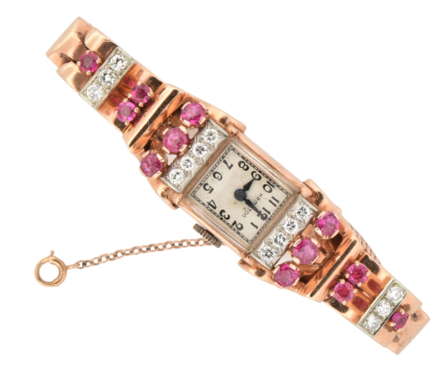 Description: Dating back to around 1940, here we have a vintage Hamilton wrist watch with diamonds and rubies. There is a total of 14 diamonds ranging from 2-2.5mm and totaling 2.22 cttw, SI1 clarity, G-H color. This retro-modern beauty also holds 14 faceted round rubies ranging in size from 3-3.5mm. Length 6.5”, 24.11 dwt.
