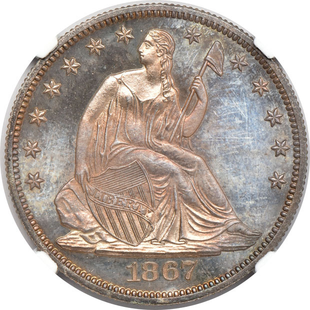 Description: Despite some milky haze in either obverse field, most viewing angles create an inspiring and lovely appearance for this post-Civil War production. Multiple strikes off the dies banged out truly impressive definition overall, with each star individually popping off the mirrored fields. Patina across the entire surface likely prohibits a cameo designation yet there is plainly some contrast to be seen.