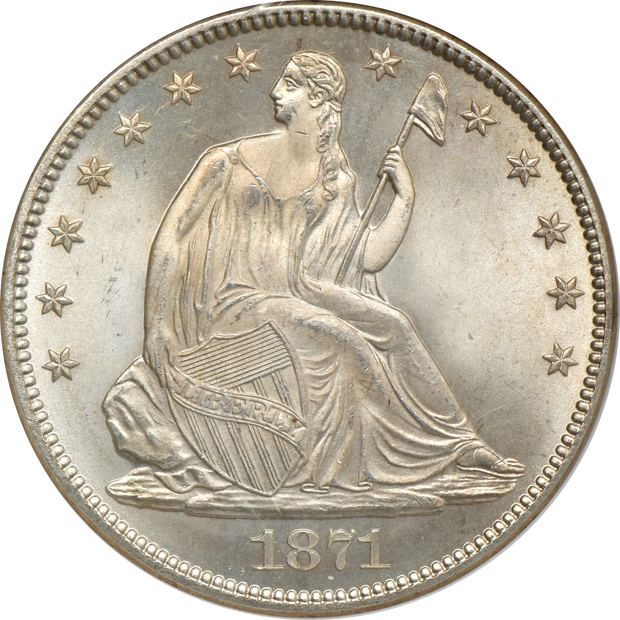 Description: B.E. Consignment. 1 graded MS-67, the sole finest known at any reputable grading service (including CAC). While known as a common date at most any grade, the 1871 like nearly any other date in the series becomes rare at or above the gem grade level, but as has been alluded, this phenomenal example ranks as the sole finest example certified. While not at all prooflike -- in fact, both sides display absolutely mesmerizing cartwheel luster over marvelously frosted surfaces -- the major devices are textured more a whisker more heavily than the surrounding fields, creating an impression of cameo contrast. Nary a hint of toning visits either side, although the surfaces have splendidly mellowed into classic, faint almond-gold hues. Exquisitely sharp overall, showing extremely faint weakness at Liberty's head and over the eagle's left (observed) talon.