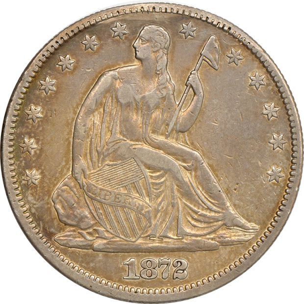 Description: Large mintmark. Cataloger's grade: [XF/improperly cleaned] and still showing some frosty luster in the reverse periphery. Overall, effects of an old cleaning have become significantly diminished by a layer of peach-amber patina that has started to layer the whole surface. Only a quarter-million 1872-CC half-dollars were struck, yet it is a notable key in the series, made all the more popular by the famous mintmark.