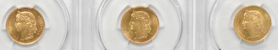 Description: While the Swiss 20 Franc gold coin is a popular choice among bullion investors as a low premium way to buy smaller gold, there are some lower mintage issues that can be very difficult to attain. This five piece lot of PCGS certified 20 Francs offers five such examples and includes an 1883 MS-63, an 1891-B MS-61, an 1892-B MS-62, an 1893-B MS-61, and an 1893-B MS-62. Each of these offers a very similar aesthetic displaying yellow-orange surfaces that are bright and lustrous with some minor bag marks noticed. These issues have a combined catalog value north of $12,000 (ck)!