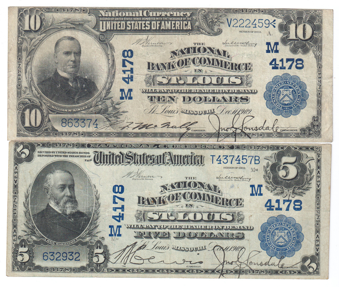 Description: Meet me in St. Louis. This fun run of five St. Louis National Bank notes includes four issues that are #4178 Charter that includes a 1902 $5 and $10 National Bank of Commerce, and a 1929 $5 and $20 mercantile-Commerce National Bank notes. The lone remaining issue is a 1902 PCGS Currency VF-25 National City Bank of St. Louis. It is worth noting that the signature quality is very nice throughout this grouping (ck).
