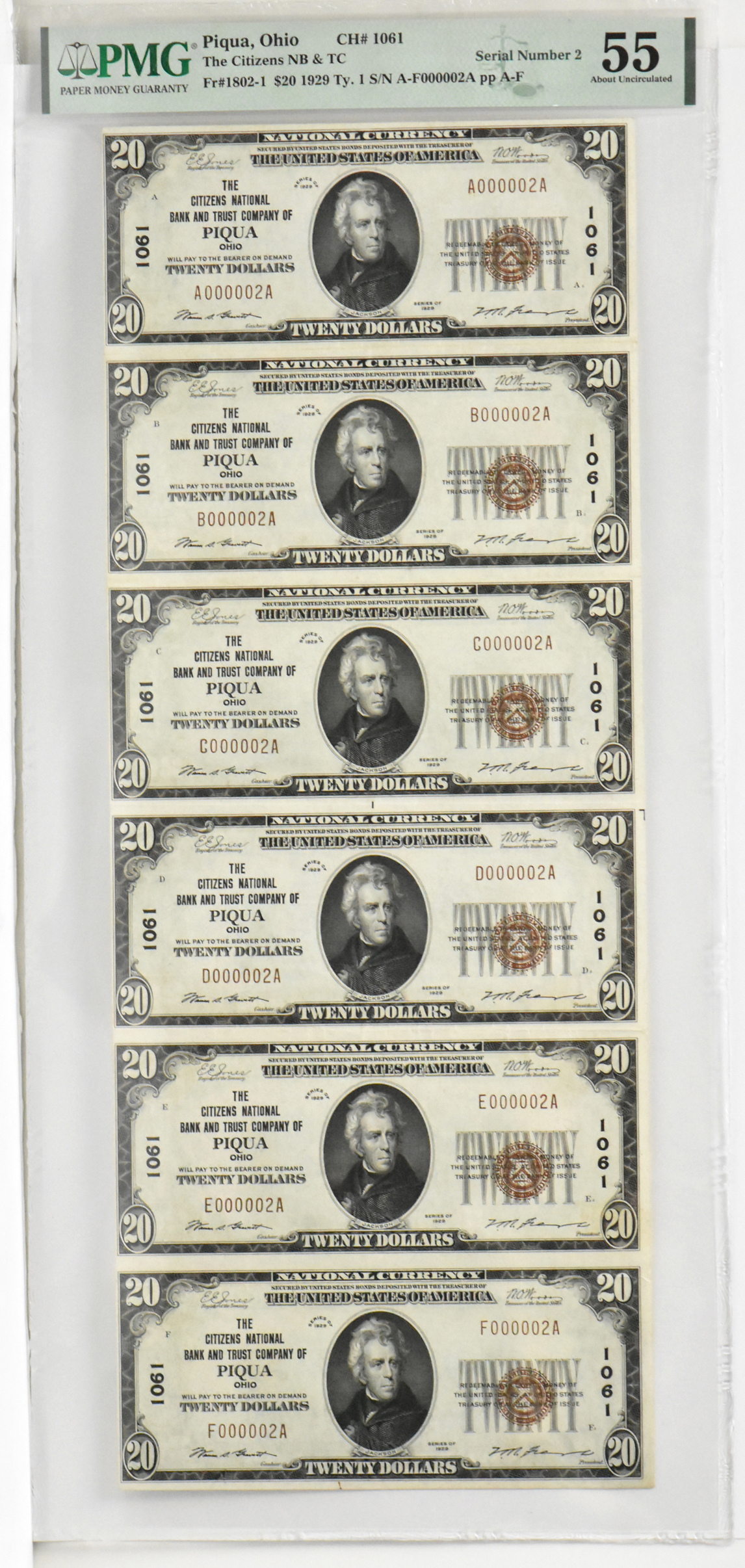 Description: Here is an uncut sheet of six 1929 Type 1 $20 National Bank notes from Piqua, Ohio have been certified by PMG as AU-55. Each of these notes are serial number 2 and show signs of having been folded in the center between each example. While it is not a perfect representation of the type, this is still a very scarce sheet to find fully intact (ck).