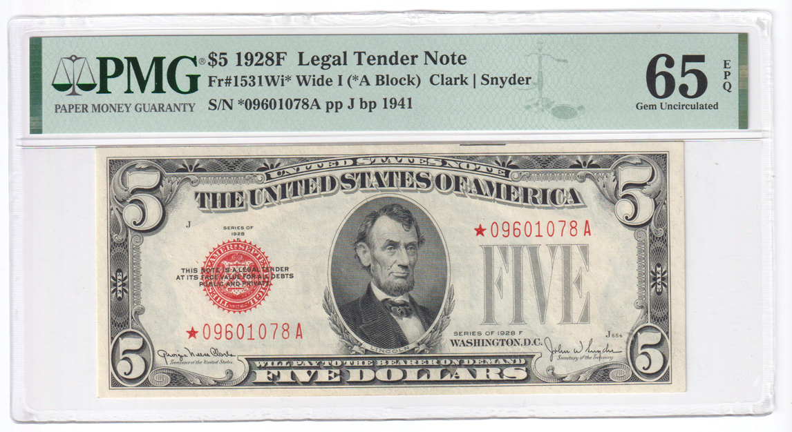 Lot Title: 1928-F $5 Star Fr# 1531Wi* - PMG GemCU-65 EPQ