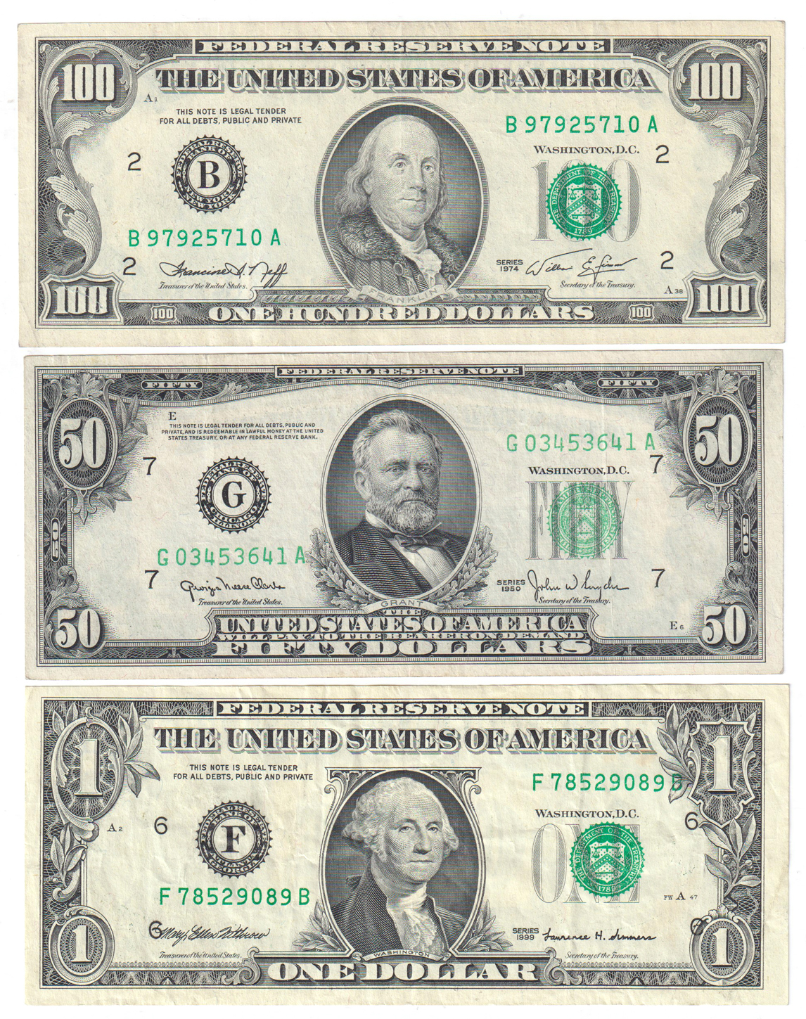Description: Back down to the minors. A total of five small size Federal Reserve note errors including three raw issues offering shift errors including a 1974 $100, a 1950 $50, and a 1999 $1. The remaining two notes are PCGS Currency certified and includes a 2009A $100 FRN CHCU-62PPQ cutting error and a 1974 $1 FRN VCHCU-64PPQ missing black overprint (ck).