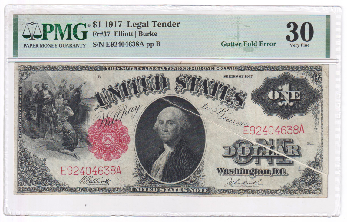 Lot Title: Error Currency - 1917 $1 Legal Tender Fr# 37 Gutter Fold - PMG VF-30