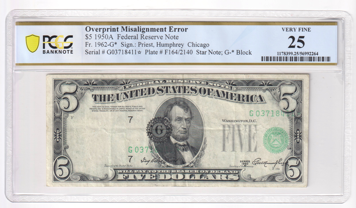 Lot Title: Error Currency - 1950-A $5 Chicago FRN Star Fr# 1962-G* - Overprint Misalignment PCGS VF-25