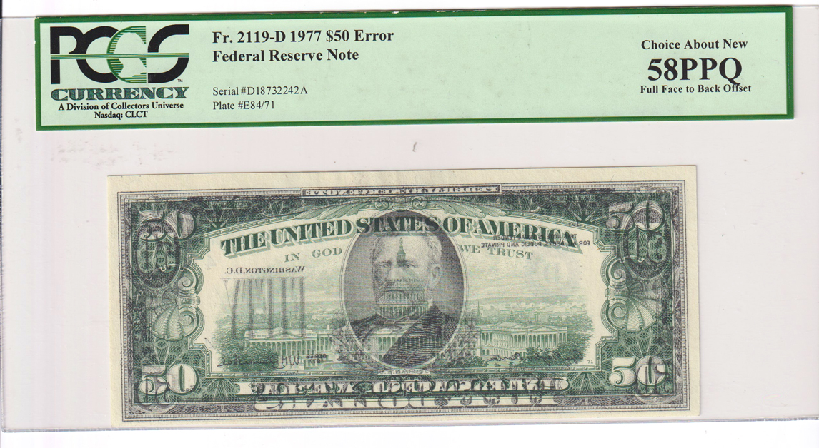 Lot Title: Error Currency - 1977 $50 Cleveland Federal Reserve Note Fr# 2119-D Full Face to Back Offset - PCGS AU-58 PPQ