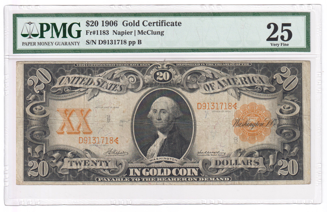 Lot Title: 1906 $20 Gold Certificate Fr# 1183 PMG VF-25, and a 1923 $1 Silver Certificate Fr# 237 PCGS ChCU-64 PPQ (damaged holder)