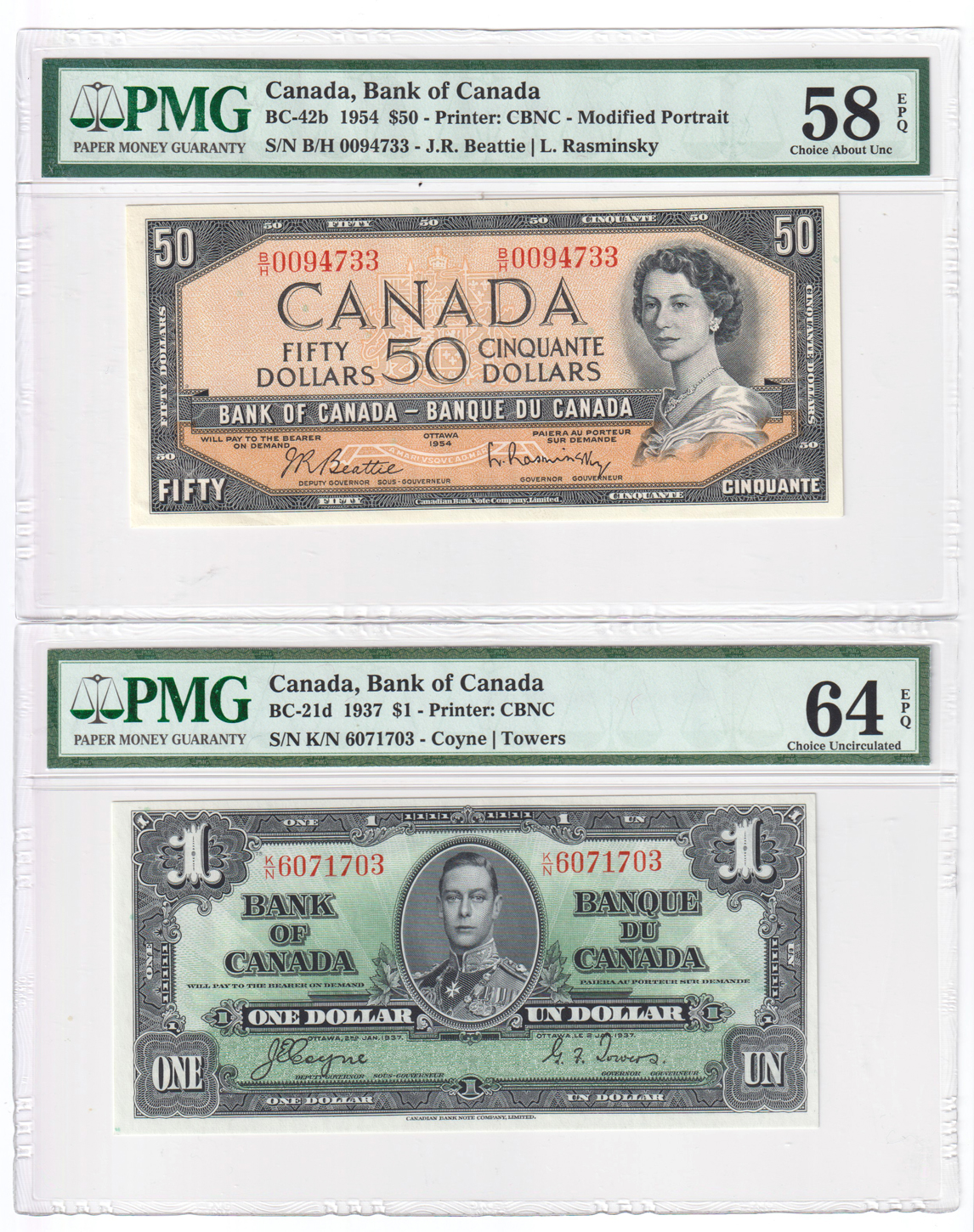 Description: Canadian Cash! Vibrant shades of orange, green, yellow, and purple are on full display within this five-note group lot that includes a 1935 WBG EF-40 $10, a 1931 PCGS Currency VF-35PPQ Bank of Montreal, a 1937 PMG CHCU-64EPQ Bank of Canada $1, a 1954 PMG CHCU-64EPQ Bank of Canada $5, and a 1954 PMG CHAU-58EPQ Bank of Canada $50 note. A truly eye-catching lot (ck).